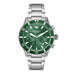 This 43mm watch features a green finish, sunray dial, lume stick indexes, chronograph movement and two-tone stainless steel bracelet.