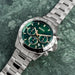 Vibrant emerald-green sunray dial that changes beautifully with the light.
