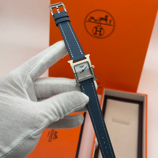 Hermes Heure H Silver Stress Dial With Blue Leather Strap Watch