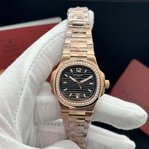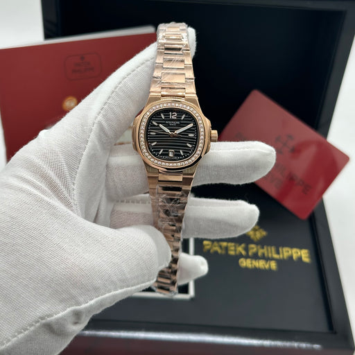 Patek Philippe Nautilus-Style Rose Gold 33MM Watch – Diamond Bezel & Black Dial
