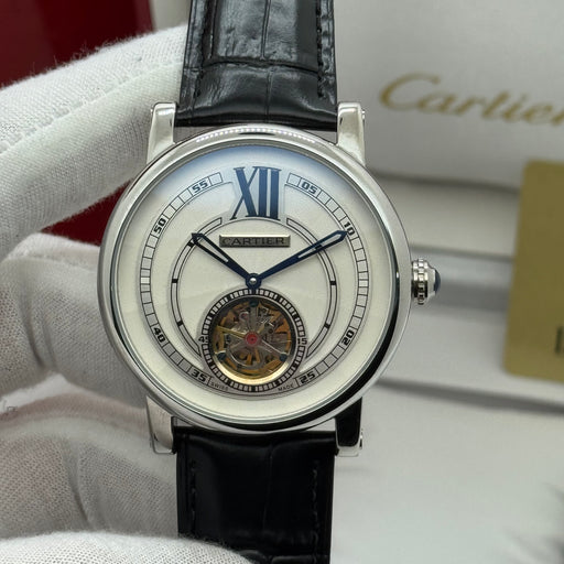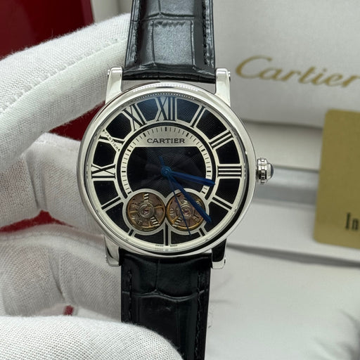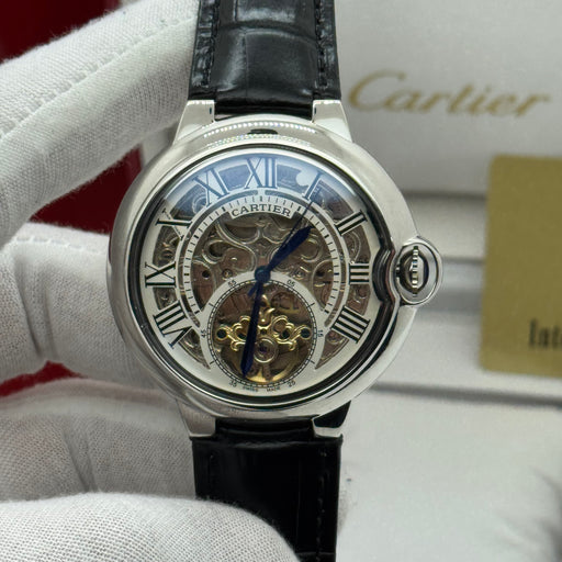 Cartier Full Skeleton Automatic Dress Watch – Silver Case, Black Leather Strap