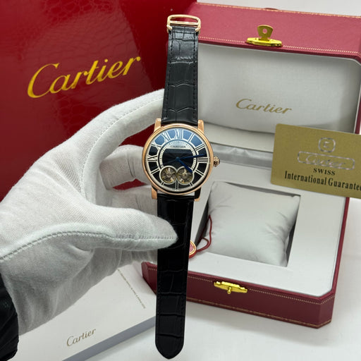 Cartier Skeleton Dual-Balance Dress Watch – Rose Gold Case, Black Leather Strap