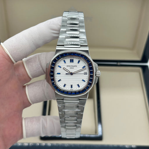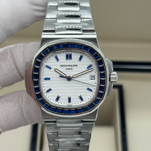 Original price $760.00 - Original price $760.00Original price$760.00$760.00 - $760.00Current price $760.00Swiss Super Clone – Highest Grade 40mm Stainless Steel Case & Bracelet White Nautilus Textured Dial Blue Baguette Crystal Bezel + Match...