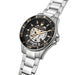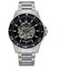 Stainless steel case with a stainless steel bracelet. Unidirectional rotating stainless steel bezel with a black ring. Black (skeleton) dial with luminous gold-tone hands and index hour markers.