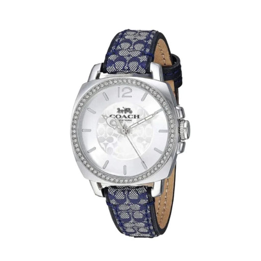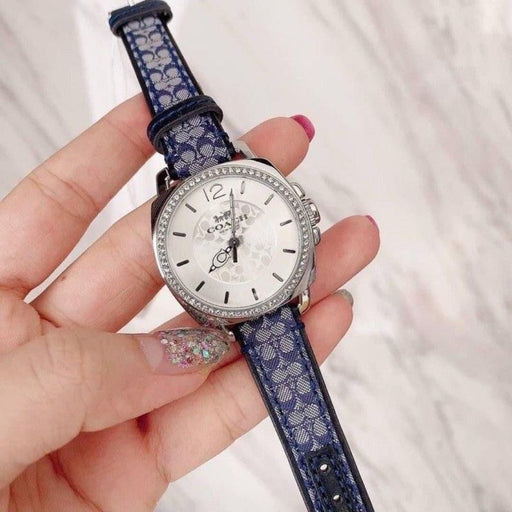 Coach Women’s Silver-Tone Crystal Bezel Watch with Blue Signature Strap 14503149 - Authentic