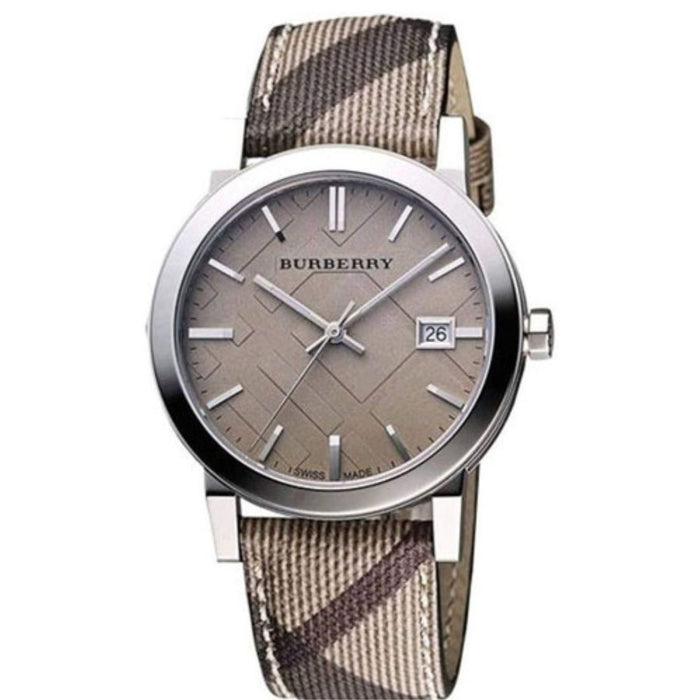 This elegant Burberry watch features a taupe textured dial with silver-tone hour markers and a date window, enclosed in a polished stainless steel case. The iconic Burberry check fabric strap adds a signature touch, blending British heritage with modern sophistication. Swiss-made precision completes this timeless accessory.