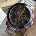 Sporty yet refined, this Burberry chronograph watch features a bold black dial with red accents, three subdials, and a rotating bezel. Crafted in brushed stainless steel, it offers precision timekeeping with Swiss-made movement and a date window for everyday performance and timeless style